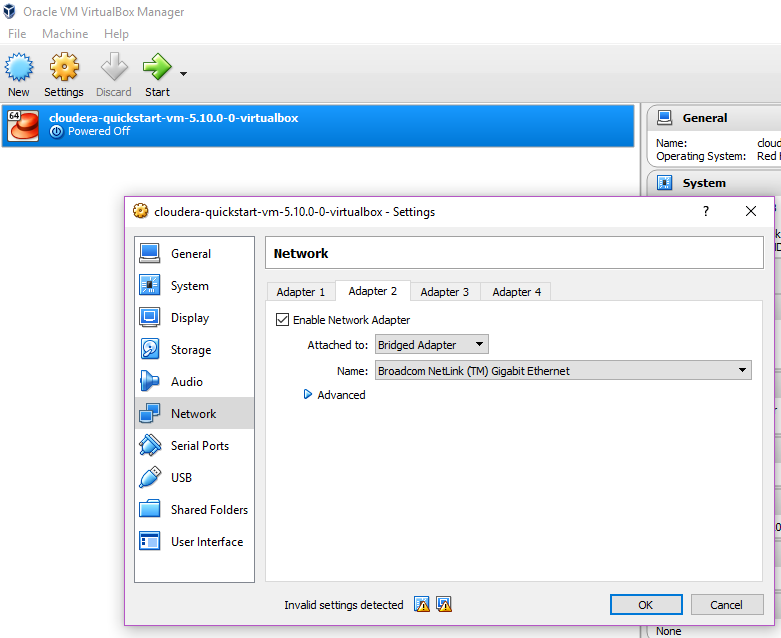 Click import & after it’s is finished, you need to “Enable a network adapter” and add a card in the form of a “Bridged adapter” so that your VM gets an IP address which your Windows OS and your code will use to communicate with the Hadoop cluster running inside the VM.