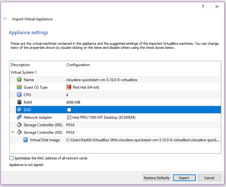 After downloading the QuickStart VM image, which is a pretty hefty download at around 5gb, extract the zip file and you’ll find 2 files. Open the “cloudera-quickstart-vm-5.10.0-0-virtualbox.ovf” file (the smaller file).