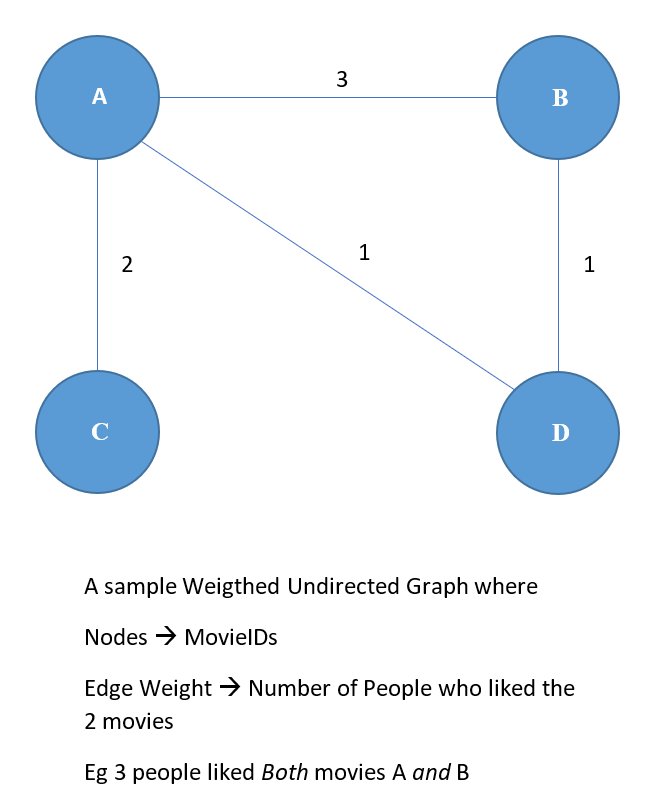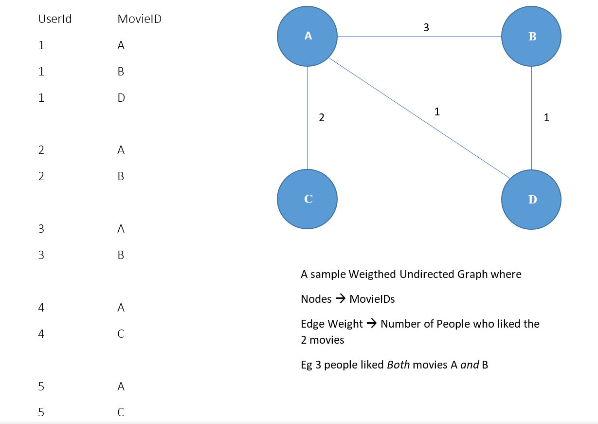 - So if a new User likes movie A , the recommendations will be B,C,D in that order due to their weights with A being 3, 2 & 1 respectively.