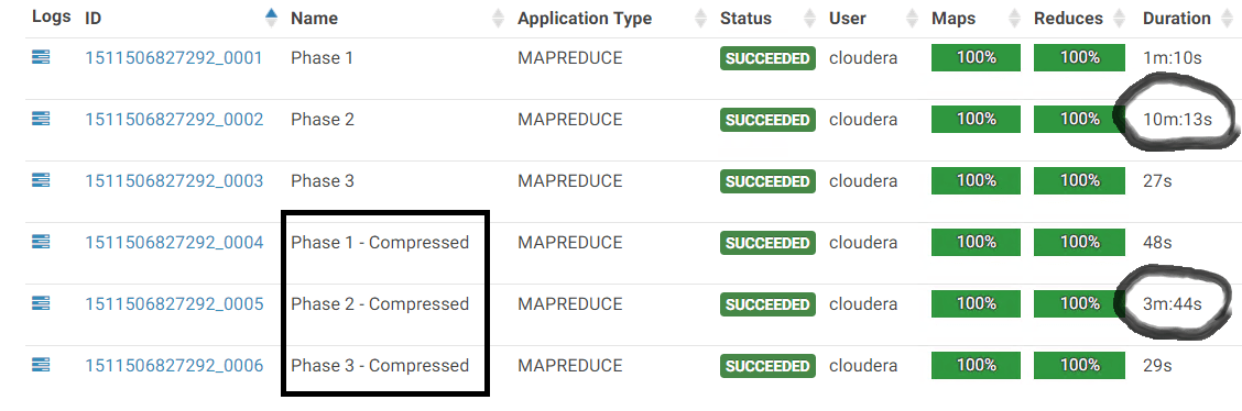 We can verify that the compression is enabled & working by checking out the Map Output Bytes and Map Output Materialized Bytes counter. By simply noticing reduction in runtime here, the impact of compression seems immense.